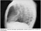 Yirmi ya??nda erkek hastan?n, alt? ayd?r halsizlik ve ?? ayd?r sol yan a?r?s? yak?nmalar? vard?. Askerlik g?revini yapmakta iken Verem Sava? Dispanseri taraf?ndan yap?lan taramada ?ekilen PA akci?er grafisinde ku?kulu lezyon saptanmas? ?zerine hastanemize sevk edildi. Fizik muayene bulgular? normal saptand?; hastan?n ate?i; 36?C, nabz?; 63 vuru/dakika, TA; 100/65 mmHg, solunum say?s?; 16/dakika idi. ?z ge?mi?inde ve yak?n aile anamnezinde bir ?zellik yoktu. Bir paket/y?l sigara ?yk?s? vard?. Tam kan, tam idrar, sedimentasyon ve rutin biyokimya incelemeleri normal s?n?rlarda tespit edildi. PA ve lateral akci?er grafilerinde sol hemitoraksta ?st zonda SPN ile uyumlu g?r?n?m mevcuttu (Resim 1,2). Toraks bilgisayarl? tomografi (BT)'de; sol akci?er ?st lob apikoposterior segmentte, periferik yerle?imli, yakla??k 2 x 2 cm ?ap?nda, d?zg?n kont?rl?, sferik SPN ile uyumlu g?r?n?m saptand?. Mediastende patolojik boyutlarda lenfadenopati yoktu ve tan?mlanan g?r?n?m haricinde infiltrasyon ve kitle saptanmad? (Resim 3). Hasta balgam ??karamad??? i?in al?nan mide suyu asido-alkalo rezistan basil (ARB) negatif olarak de?erlendirildi ve k?lt?r?nde ?reme olmad?. Bronkoskopide endobron?iyal lezyon g?zlenmedi. Bron? lavaj? ARB negatifti ve k?lt?r?nde ?reme olmad?. Bron? lavaj? sitolojik incelemesi malignite y?n?nden negatif olarak raporland?. Kist hidatik i?in yap?lan ELISA testi negatif bulundu. Bat?n ultrasonografi (USG) incelemesi normaldi. Olgudan SPN etyolojisini ayd?nlatabilmek i?in g???s cerrahisi kons?ltasyonu al?nd? ve olguya kist hidatik ?n tan?s?yla operasyon planland?. Torakotomi ile sol ?st lobda saptanan 2 x 2 cm'lik nod?le wedge rezeksiyon uyguland? ve perioperatif patoloji kons?ltasyonu istendi. Elde edilen materyalin makroskobik incelenmesinde malignite saptanmamas? ?zerine operasyon sonland?r?ld?. Eksizyonel biyopsi ?rne?inin mikroskobik incelemesi intralober pulmoner sekestrasyon (Kesitlerde akci?er parankimi bulgular? g?steren iyi s?n?rl? nod?ler lezyon izlenmektedir. G?m??leme y?ntemiyle yap?lan incelemede lezyonda yayg?n olarak retik?lin liflerinde art??, baz?lar? hiperplastik g?r?n?mde damar yap?lar? ve d?zensiz bron? alveol ?at?lar? g?r?lmektedir) olarak raporlanm??t?r.