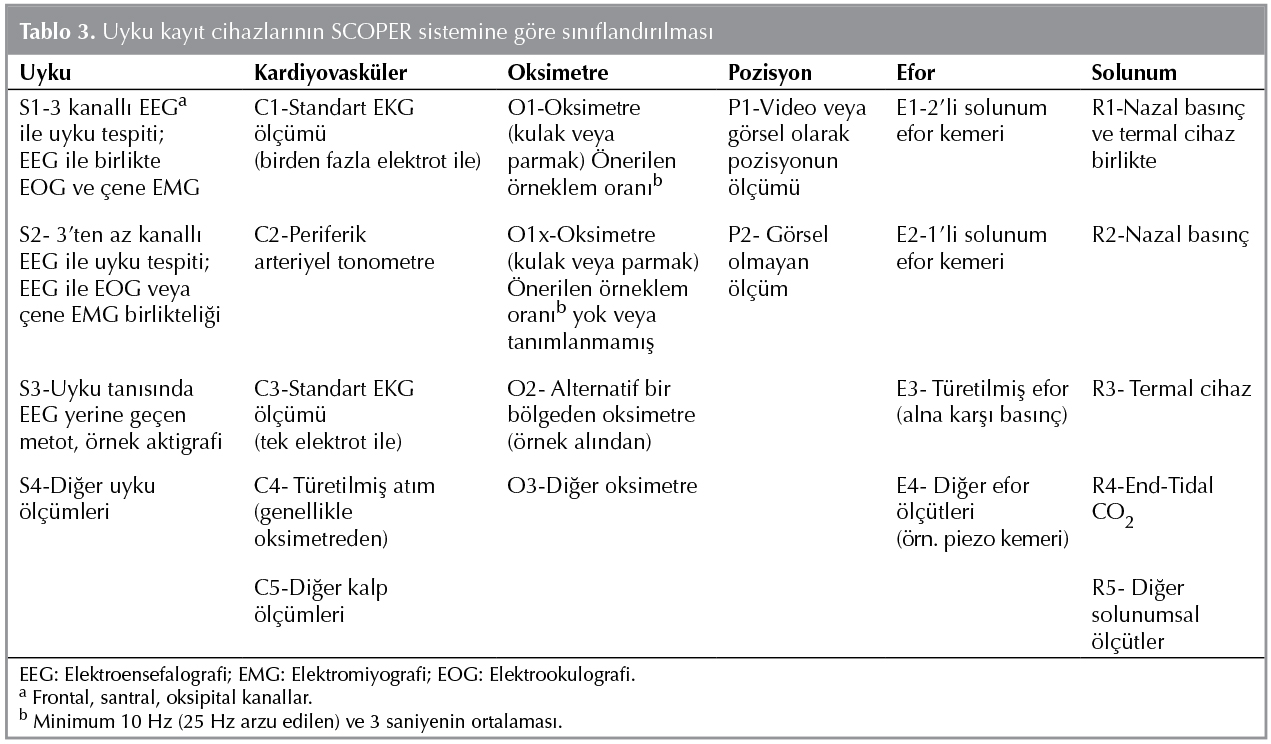 Yukarıda bahsedilen portabl kayıt cihazları, 2011'de AASM tarafından yapılan yeni bir revizyon ile klasifiye edilmiş, kayıt kanal tiplerine ve i?erdikleri teknolojiye g?re kategorize edilmiştir. Bu sistem SCOPER kategorizasyon sistemi olarak adlandırılmıştır (17). SCOPER kısaltması; uyku (sleep), kardiyak ?l??mler (Cardiac measures), oksimetre (oximetry), pozisyon (position), efor (effort) ve solunum (respiration) kelimelerinin başharflerinden oluşmaktadır. Bu sistem sayesinde mevcut PM cihazıyla hangi parametrelerin hangi y?ntemle ?l??lebildiği konusunda daha detaylı tanımlamalar yapılabilmektedir (Tablo 3).