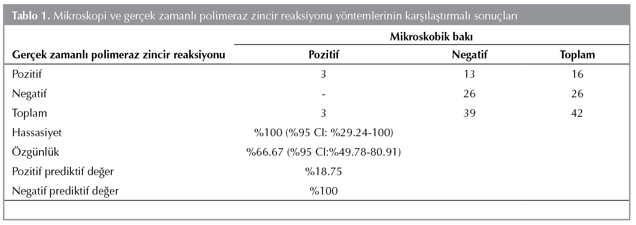 Toplam 42 hastanın (24 erkek, yaş ortalaması 31.29 ? 26.43 (min: 1-max: 85) BAL ?rneği ?alışılmıştır. On altı ?rnekte herhangi bir test y?ntemi ile pozitiflik saptanmıştır. ?? ?rnek, ger?ek zamanlı PCR ve mikroskobi ile pozitif saptanmış iken 13 ?rnek sadece ger?ek zamanlı PCR ile pozitif bulunmuştur. Mikroskopik bakı altın standart olarak alınarak PCR y?nteminin hassasiyet ve ?zg?nl?k değerleri hesaplanmıştır (Tablo 1).