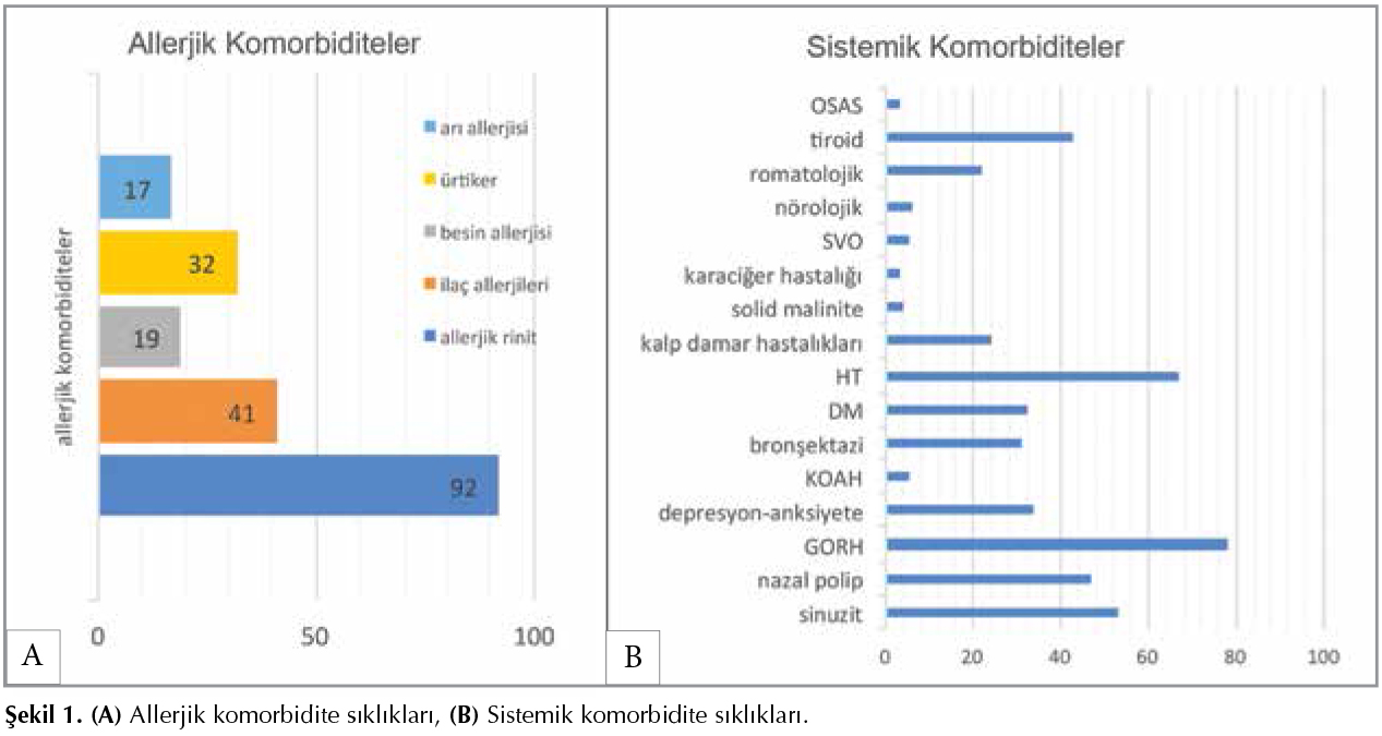 Hastalara en az 1 yıldır takipte oldukları merkezde ve konunun uzmanı hekim tarafından tanı konulmuş allerjik ya da sistemik komorbiditeleri olup olmadığı soruldu. Allerjik komorbiditeler arasında; allerjik rinit (AR), arı allerjisi, ila? allerjisi, ?rtiker ve besin allerjisi sorgulandı. Sistemik komorbiditeler arasında; HT, DM, kalp ve damar hastalıkları, psikolojik hastalıklar, tiroid hastalıkları, solid maligniteler, n?rolojik hastalıklar, obstr?ktif uyku apne sendromu (OUAS), gastro?zafagial refl? hastalığı (G?RH), karaciğer hastalıkları, astım dışı solunum sistem hastalıkları, nazal polip, sin?zit ve romatolojik hastalıklar sorgulandı.