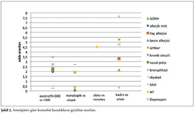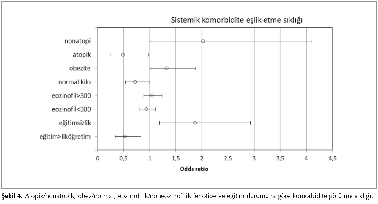 Eozinofilik-noneozinofilik: Eozinofilik fenotipteki astımlılarda non-eozinofilik fenotipte olanlara g?re astım daha kontrols?z ve daha ağır bulundu (p= 0.03) (p< 0.001). Eozinofil d?zeyinin > 300 olması kontrols?z olma riskini arttırıyordu (OR: 2.12, %95 CI: 1.16-3.84) (p= 0.01). Eozinofilik olanlarda allerjik komorbiditeler daha sıktı (?zellikle AR ve ila? allerjisi) (p= 0.01) (OR: 2.20, %95 CI: 1.2-3.8), ama sistemik komorbidite eşlik etme olasılığının artmadığı g?r?ld? (OR:1.05, %95 CI: 0.8-1.2) (p> 0.05) (Şekil 4). Eozinofilik astımlılarda AR (OR: 1.97, p= 0.009), ila? allerjisi (OR: 2.15, p= 0.02), kronik sin?zit (OR: 2.71, p= 0.001), nazal polip (OR: 2.29, p= 0.009), bronşektazi (OR: 3.45, p= 0.002) eşlik etme şansı y?ksek, DM (OR: 0.49, p= 0.06), KAH (OR: 0.28, p= 0.03) eşlik etme şansı d?ş?k bulundu (Şekil 2).