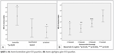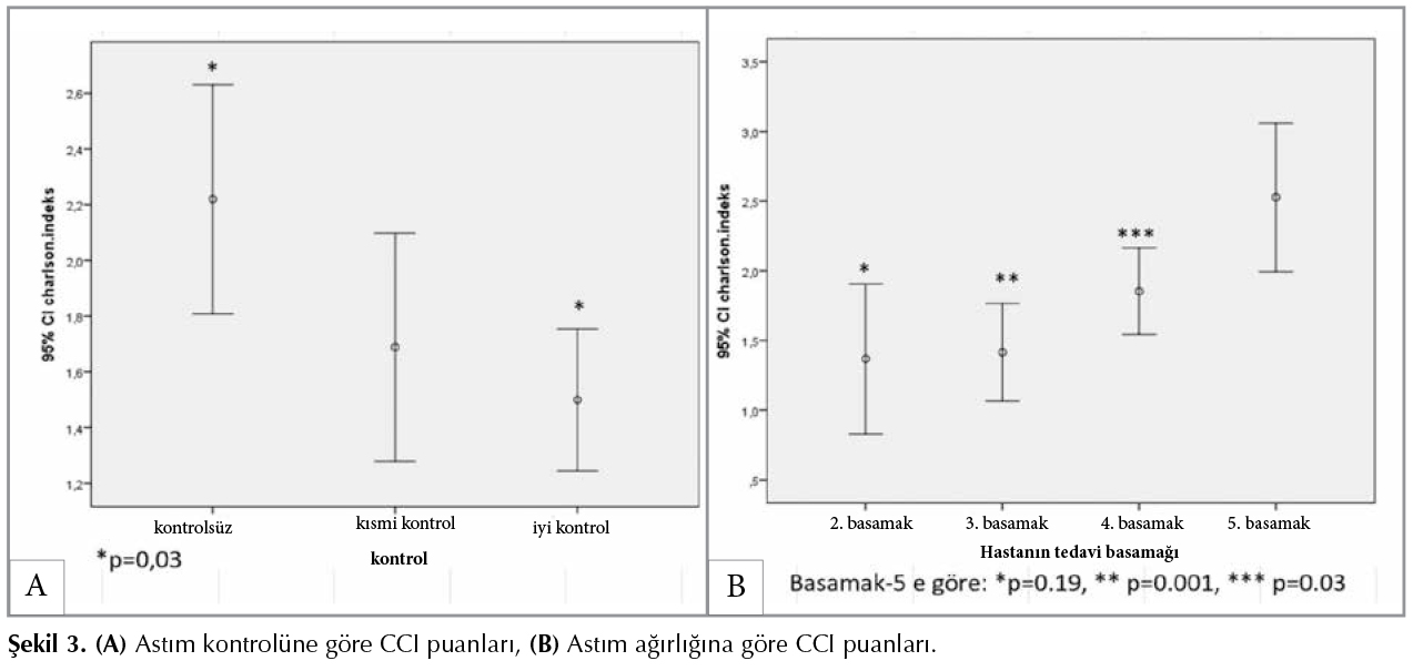Allerjik komorbiditeler ile astım kontrol? ve hastalık ağırlığı arasında bir ilişki bulunamadı. Sistemik komorbiditeleri olanlarda astımın kontrols?z olma ihtimalinin 1.76 kat daha fazla olduğu g?r?ld?. Ayrıca CCI'ya g?re değerlendirildiğinde, astımı kontrols?z olanlarda CCI: 2.22, kısmi kontrolde olanlarda 1.69 ve iyi kontroll?lerde ise 1.50 bulundu (p= 0.03) (Şekil 3A). Astım ağırlığı ile CCI arasında da lineer bir korelasyon vardı (CC: 0.22, p= 0.001). Basamak-5 tedavi alan hastalara g?re basamak-2, 3 ve 4 tedavi alanlarda CCI daha d?ş?kt? (basamak 2'den 5'e g?re sırasıyla CCI: 1.37-1.42-1.85-2.53) (Şekil 3B). Hastalığın ağırlığının artmasıyla birlikte komorbidite riskinin de arttığı g?r?ld?. Basamak 2 ve 3 tedavi alanlarda bu risk benzer, basamak 4 tedavi alanlarda 1.2 kat, basamak 5 tedavi alanlar ise komorbiditeler y?n?nden 1.6 kat daha riskli bulundu (p= 0.01). Komorbiditeler teker teker değerlendirildiğinde kronik sin?zit kontrols?zl?k i?in bir risk fakt?r? olarak saptandı (OR: 2.27, %95 CI: 1.12-4.54). Ayrıca depresyonda olanlarda da astım kontrol? daha bozuktu (OR: 1.47, %95 CI: 0.65-3.2). Nazal polip veya bronşektazinin eşlik ettiği hastalarda ise astım daha ağırdı (OR: 4.13, %95 CI: 1.14-14.8; OR: 12.99, %95 CI: 1.26-121.2) (p= 0.002).