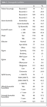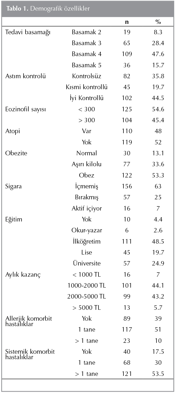 ?alışmaya ortalama yaşları 51.25 ? 12.02 olan 229 hasta (29E/200K, %12.7/87.3) alındı. Hastaların %47'si basamak-4 tedavi almaktaydı ve %44.5'inde astım iyi kontroll?yd?. Hastaların %53.3 obezdi ve nonatopiklerin sayısı atopiklere g?re daha fazlaydı (Tablo 1).