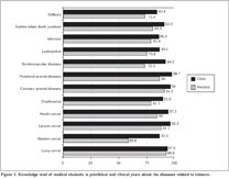 When the knowledge level about the harms of tobacco was evaluated, it was found that knowledge about the harms of active smoking was increasing as the grade was higher (grade 1: 77.4%, grade 2: 81.6%, grade 3: 88.9%, grade 4: 94.4%, grade 5: 94%, grade 6: 94.5%). The knowledge level of students who had been smoking for a long time was lower (p< 0.05). Knowledge level of females in grade 1 was significantly higher than males (p< 0.05). The most known illnesses related to smoking were lung cancers, heart diseases, larynx cancers, peripheral vascular diseases, mouth cancers, infections, sudden infant death syndromes, emphysema, cerebral vascular diseases, leukoplakia, and the least known were bladder cancers and stillbirths. Knowledge level about the harms of active smoking was found to be lower in preclinical classes (grade 1, 2, 3) than clinical classes (grade 4, 5, 6) (p< 0.05). Bladder cancer (65.8%) and stillbirth (72.5%) were significantly less known in preclinical grades (Figure 1).