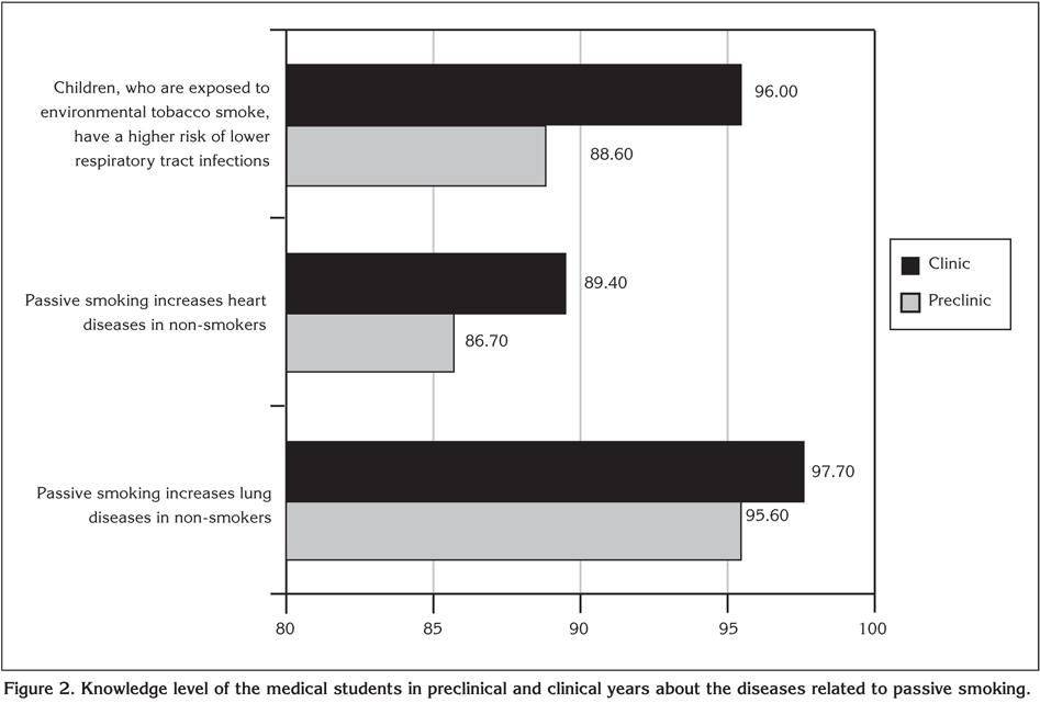 It was found that the knowledge level about harms of passive smoking was higher in higher grades (grade 1: 82.3%, grade 2: 93.6%, grade 3: 93.6%, grade 4: 94.9%, grade 5: 94%, grade 6: 94.2%, p< 0.05). Females knew significantly more than males about the harms of passive smoking (p< 0.05). Knowledge level about passive smoking and lung diseases was higher in preclinical grades (95.6%) than knowledge of heart diseases (86.7%) and lower respiratory tract infections in children (88.6%) (Figure 2).