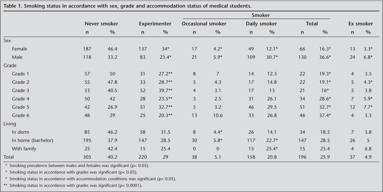 764 out of 864 students (89.4%) were reached and completed the questionnaire. Answers of eight students were out of consistency, so they were excluded and 758 questionnaires (88.7%) were taken into evaluation. Out of 758, 355 (46.8%) were males and 403 (53.2%) were females. Average age of trying smoking for the first time was 14.3 ? 4.2 years for males and 15.3 ? 3.8 years for females (p< 0.05). It was found that 25.9% of the students was current smoker (36.6% of males, 16.3% of females), 4.9% was exsmoker, and 69.2% was non-smoker (29% experimenter, 40.2% never smoker). It was found that smoking rate was increasing from the first grade to the sixth grade and smoking rate was low in the first three years (19.3%, 19.1%, 16%). Students staying in dormitories had lower smoking prevalence (18.5%) than the ones staying in bachelor homes (28.5%) or living with their families (25.4%). Smoking status in regard to sex, grade and accommodation conditions is shown in Table 1.