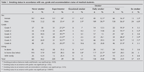 764 students out of 854 students, who were attending Medical Faculty in 2006-2007, formed the study group. To reach all the students was aimed, so sampling procedure was not performed. A self-administered survey questionnaire, which was prepared based on WHO questionnaires, was first administered to 20 nursing students, and the framework of the survey was formed after it was validated in aspects of reliability and consistency. The survey questionnaire consisted of questions about demographics, smoking status, accommodation conditions, and knowledge level about harms of smoking and environmental tobacco smoke. In addition, the questionnaire consisted of questions on attitude and behaviors about smoking and tobacco control efforts. The definitions for smoking status were as in WHO's criteria [never smoker, current smoker (occasional and daily smoker) and exsmoker] (4).? These definitions and questions to asses that were identical with our study done in 1999.