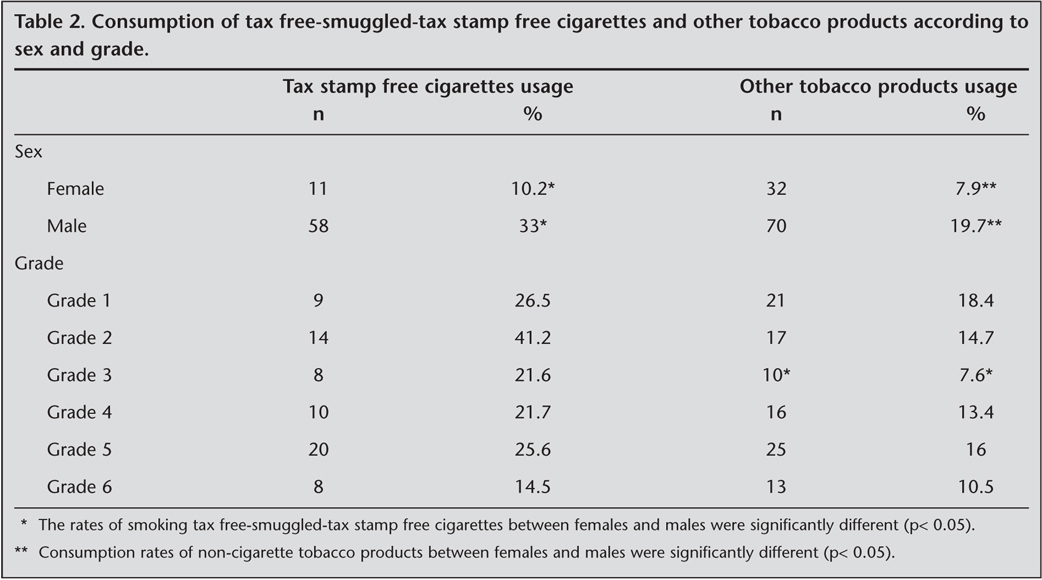 Consumption of duty free/smuggled/tax stamp free cigarettes was significantly more common among males than females (33% vs. 10.2%, p< 0.05) (Table 2). Consumption of tobacco products other than cigarettes was also more common among males (19.7% vs. 7.9%, p< 0.05), and the rate was lower among third year students. Students who stated using other tobacco products had used water-pipes (37.2%), cigars (9.2%) and pipes (0.5%).