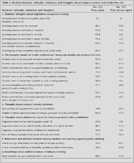 In general, there were agreements (> 85%) about the health professionals' being role models in society. In general, they thought that doctors must help for smoking cessation. However, 24.8% of students thought that professional advice could not help. And 28.9% of students thought smoker doctors can help smokers as much as non-smoker doctors. Their thoughts about behaviors of tobacco industry were that sponsorship must be prohibited (79.8%), and explicit and hidden advertisements of tobacco products must be prohibited (82.3%). And also, they thought that adolescents' access to tobacco products must be restricted. But, their knowledge about the fact that tobacco price policy is an effective tobacco control method was lower (71.5%). Only 33.3% of students were confident about helping people for quitting. More than half (50.8%) of the students did not warn smokers smoking in hospitals, faculties or other closed areas. Most of the students (88.4%) did not have enough knowledge about how addictive smoking is.