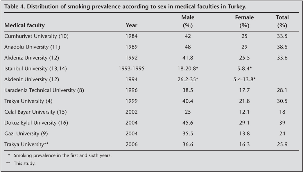 In the studies worldwide, which included more than 9000 medical students in 51 faculties in 42 countries, smoking prevalence was 0-56.9% for males and 0-44.7% for females (6,7). The surveys done among the students of faculty of medicine in Turkey are shown on Table 4 (5,8-16). When compared, our findings are similar with the results of the studies done by Can et al. and Ilhan et al (8,9).