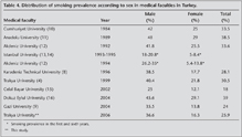 In this study, we found that smoking prevalence among medical students was 25.9% (36.6% for males and 16.3% for females). In our 1999 historical control study, smoking prevalence was 30.5% (40.4% for males, 21.8% for females) (5). We thought that decrease in smoking prevalence is not significant over these seven years (only 3.8% drop for males and 5.5% for females) (5). Local tobacco control efforts during these seven years from 1999 to 2006 were local awareness campaigns twice or thrice in a year, institutions of smoking cessation clinic in the hospital (in 2001), organizing uncoordinated lectures about harms of tobacco smoking from grade 1 to 5 (from 2001), public declarations and setting the hospitals as smoke-free in 2005. During these seven years, at national level, health warnings appeared in 2006 and national public awareness campaigns on mass media were seen twice or thrice in a year from 2000s.