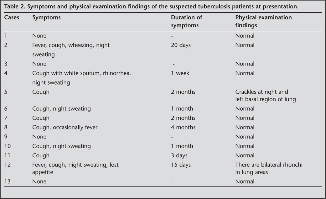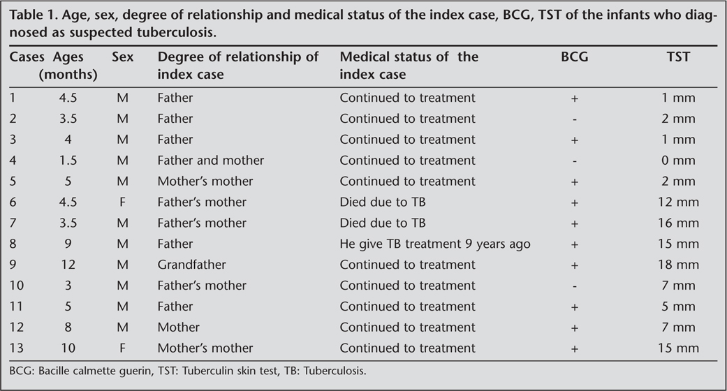 The patient age ranged from 1.5-12 months, days, mean age 5.6 months. The male to female ratio was 11/2. The sources of infection were identified in 12 of the 13 patients. The father of the eighth case had been given anti-TB treatment 9 years ago. The paternal grandmother of the sixth and seventh patients who are cousins had died some weeks before presentation of these patients. The cases are listed with the categories of age, sex, degree of relationship of the adult index cases with patients, medical status of index cases, BCG, TST in Table 1. The median duration of symptoms was 30 days that ranged between 1 week to 4 months. The most frequent symptoms were cough in 10 (72.4%) patients, night sweating in 5 (35.7%) and fever in 3 (21.4%). Four patients didn't have any symptoms. Physical examinations were normal in 11 patients. Symptoms of the patients at presentation and physical examination findings are given in Table 2.