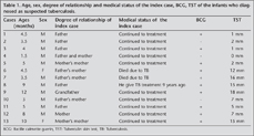 In our study all of the patients had history of contact with adult cases and TB investigated in these infants for this reason. TB control programs in developing countries aim mainly to detect and treat adults with sputum smear-positive tuberculosis, because they are the most infectious patients. Investigations of contacts and treatment of contacts with latent TB infection is a strategy in the control and elimination of TB in developed countries. In a study of 596 culture-confirmed childhoods TB from South Africa, a history of contact with an infectious pulmonary TB case was recorded in 295 (49.5%) children. The source case was a parent in 121 (41.0%), an uncle/aunt in 68 (23.1%), a grandparent in 26 (8.8%), an older sibling in 15 (5.1%), other household cases in 27 (9.2%), a neighbor in 19 (6.4%) and another or unknown case in 28 (9.5%). Twenty three children (7.8%) had more than one source case (4). We think that adult index case is an important clue for the diagnosis of infant tuberculosis.
