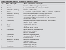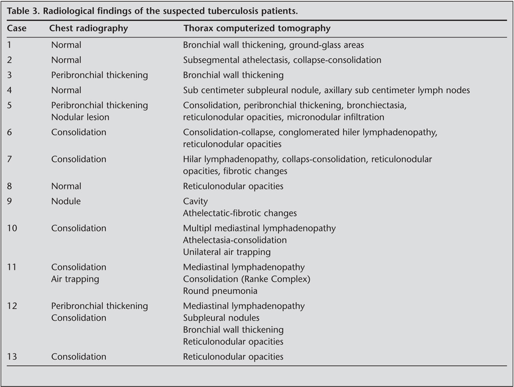 The presence of lymphadenopathy on CXR is frequently used for diagnosing pulmonary TB in children. However, the low accuracy of CXR in assessing lymphadenopathy has been reported previously (15). Major problem is the quality of CXRs, e.g. poor inspiratory or rotated film might give an impression of a "widened mediastinum". It has been believed that caution should be exercised in using the presence of lymphadenopathy on CXR to diagnose tuberculosis in children (14,15). CT findings of pulmonary TB in children and to define indications for the use of CT were studied previously in infants and children. Mediastinal or hilar lymphadenopathy revealed as low-attenuation nodes with rim enhancement or calcification was reported as the most characteristic CT finding of pulmonary TB in children (16). It is well established that CT scans have advantages over CXR for detecting TB lymphadenopathy, the bronchogenic spread of TB and airway complications (2,16,17,18). In a 12-year study of 25 infants with TB whose age were between 2 to 12 months (mean age, 5.9 months), radiographic findings had been reviewed retrospectively. CXR were performed initially in all patients. In this study thorax CT scans were performed 1-10 days (mean 4 days) after initial CXR for one or more of the following reasons: to evaluate unusual findings on radiographs such as mass like lesions or widespread nodules; to find or confirm lymphadenopathy; and to detect or evaluate complications. Authors reported that, CXR showed mediastinal lymphadenopathy and parenchymal abnormality in 72% and 96% of patients, respectively, and the most frequent radiographic finding of pulmonary parenchymal lesions was consolidation. In four patients (24%) in this series, the diagnosis of tuberculosis was suggested only after a CT scan revealed enlarged lymph nodes with central necrosis (18). In our cases of 1, 3 and 13 had not apparent disease or abnormal chest X-ray (case 1), but they had a positive TST (case 13) or history of close contact, CT revealed peribronchial thickening, ground-glass areas and reticulonodular opacities suggesting TB disease. In a study that investigated CT findings in 41 children with confirmed TB, foci of nodular densities from 1 mm to 2 cm, were seen in 12 patients (29%) and bronchial wall thickening was seen in nine patients. Authors mentioned that although a similar appearance can be seen in patients with atypical mycobacterial or bacterial bnonchopneumonia, these CT findings, if present, can be helpful in diagnosing tuberculosis in children (18). Centrilobular nodules of ground-glass attenuation was reported among the CT findings with TB (9,19). Tuberculosis during early childhood, in particular, there is a continuum between tuberculosis infection and disease. When establishing the diagnosis in a child with suspected tuberculosis, the distinction between infection and disease frequently depends on the interpretation of the imaging studies. In our study, CT scan detected pathologic findings in four patients whose CXR completely normal. We detected also additional findings that we could not determine on CXR included subpleural nodules, mediastinal lymph nodes, bronchiectasia, parenchimal cavity, reticulonodular opacities, air trapping areas, round pneumonia, micronodular infiltration, athelectasia and concomitant collapse to consolidation. We think that, CT scans can be helpful in diagnosing tuberculosis when findings of CXR normal or inconclusive.