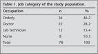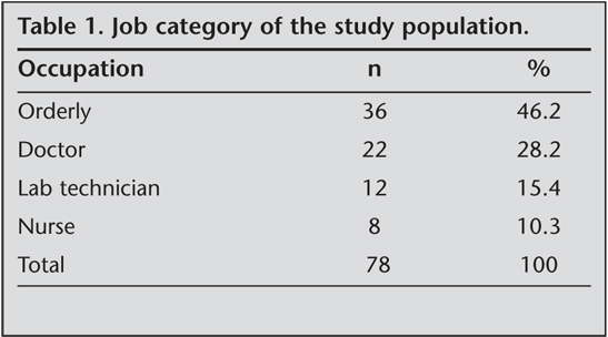 The study was conducted at Heybeliada Chest Diseases and Chest Surgery Training and Investigation Hospital between 01-31 August 2005. Thirty-three women (42.3%) and 45 men (57.7%) with a total of 78 HCW were included in the study. Mean age of the study population was 30.51 ? 8.57. Table 1 shows the distribution of patients with respect to job category.