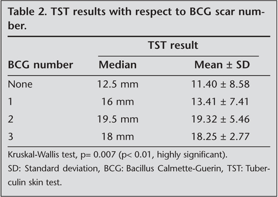 There was a statistically significant relation between the number of BCG scars and the diameter of TST (p< 0.01). The diameter of TST was significantly higher in HCWs with two BCG scars than HCWs with one scar (p= 0.002; p< 0.05) and HCWs without a BCG scar (p= 0.03; p< 0.05). The diameter of TST was significantly higher in HCWs with three BCG scars than HCWs with one scar (p= 0.04; p< 0.05). Table 2 shows the TST results with respect to BCG scar number.