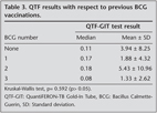Many reports showed that QTF is not affected by previous BCG vaccinations (5,6,19,20). We also found that, QTF results according to previous BCG vaccinations did not significantly differ. The clinical importance of this is that QTF-GIT test can be an alternative to TST in BCG vaccinated individuals.