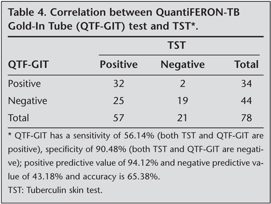 QTF results according to previous BCG vaccinations did not significantly differ (p> 0.05). Table 3 shows the QTF results with respect to previous BCG vaccinations. Concordance between test results from the TST and QTF-GIT assay was assessed using k coefficient (k: 0.346) and there was an intermediate concordance between two tests. QTF-GIT has a sensitivity of 56.14% (both TST and QTF-GIT are positive), specificity of 90.48% (both TST and QTF-GIT are negative); positive predictive value of 94.12% and negative predictive value of 43.18% and accuracy is 65.38%. Table 4 shows the correlation between QTF-GIT and TST.