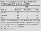 Pottumarty et al. compared TST and QTF test results and showed a significant and intermediate correlation between two tests. In our study, there was a statistically significant and a positive correlation of 40% between TST and QTF-GIT assay. We grouped the TST results into 0-4 mm, 5-9 mm, 10-15 mm and > 15 mm. When TST is > 10 mm, QTF-GIT test result was 91.2% positive. This shows that if, TST is > 10 mm, it is most likely that QTF is positive.
