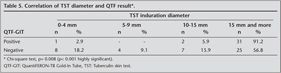 While QTF was positive in 91.2% of cases when TST was 10 mm or more, it was positive in only 2.9% of cases with TST diameter of 0 mm. There was no QTF positive case when TST diameter was between 5-9 mm. There was a statistically significant relation between TST diameter and QTF result (p< 0.01). Table 5 shows the correlation of TST diameter and QTF result.