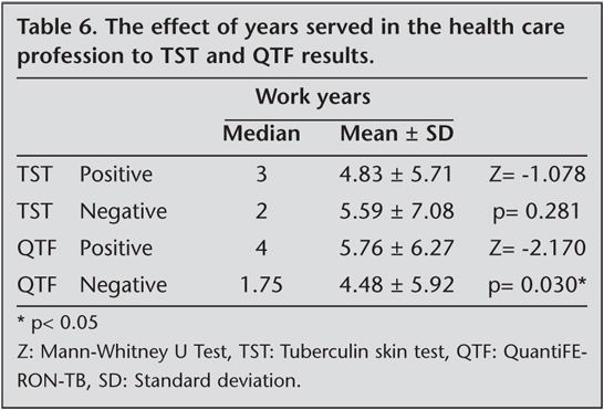 There was not a statistically significant relation between TST results and years served in the health care profession (p> 0.05). However, there was a statistically significant relation between the years served in the health care profession and QTF result (p< 0.05). Table 6 shows the effect of years served in the health care profession to TST and QTF results.