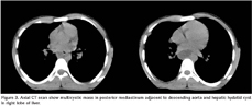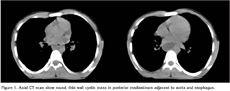 Laboratory datas were normal. There was no eosinophilia. Serology for hydatid disease was negative. Antroposterior chest X-ray showed mild cardiomegally and posterior mediastineal (retrocardiac) mass without calcification. Computed tomography (CT) without contrast revealed posterior mediastineal cystic masses without calcification adjacent to aorta and with compression on esophagus Figure 1, 2.