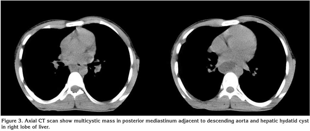 Mediastinal hydatidosis is very rare (less than 0.1% of all hydatid disease cases) that have been only anecdotally in the literature (3). To the best of our knowledge only one case of multiple mediastineal hydatid cyst has been reported previously by Rahimi-Rad et al. (3).