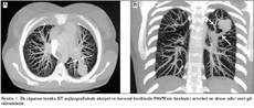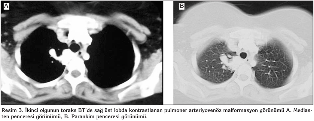 ?lk olguda multipl PAVM saptanmas? ?zerine ROWS olas?l??? nedeniyle birinci derece akrabalar?nda direkt akci?er grafisi ile yap?lan tarama sonunda hastan?n k?z karde?inde de PAVM saptand?. Yak?nmas? olmayan 20 ya??ndaki kad?n hastan?n fizik muayenesinde ve rutin kan tetkiklerinde patolojik bulgu saptanmad?. Akci?er grafisinde sa? hemitoraks ?st zonda 2 x 2 cm boyutlu g?lge koyulu?u saptand?. Kan gazlar? incelemesinde, PaO2: 53.2 mmHg, PaCO2: 27.4 mmHg, SaO2: %94 olan hastan?n toraks BT'sinde sa? ?st lob apikal segment medialinde yakla??k 31 x 21 mm boyutunda ond?le konturlu intraven?z kontrast madde (IVKM) sonras? belirgin dif?z homojen opakla?an tek besleyici arter ve veni bulunan, PAVM ile uyumlu g?r?n?m izlendi (Resim 3). Hastaya sa? torakotomi ile giri?im uyguland???nda eksplorasyonda ?st lob apikal segmentte 3 x 4 cm boyutlu PAVM ile uyumlu lezyon saptand? (Resim 4). Lokalizasyonunun uygun olmas? nedeniyle hastaya wedge rezeksiyon uyguland?. Postoperatif komplikasyon saptanmayan hasta alt?nc? g?n taburcu edildi. Patoloji sonucu PAVM ile uyumlu olarak raporlanan hasta alt?nc? ay sorunsuz olarak izlemdedir.