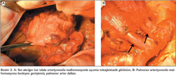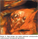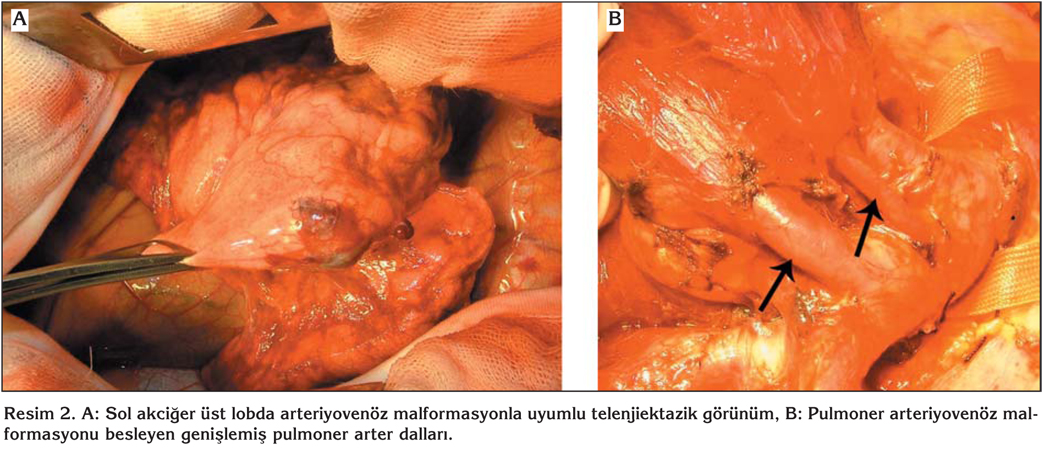 PAVM'nin multipl olmas? nedeniyle ROWS olabilece?i d???n?lerek g?z dibi ve burun, larenks, nazofarenks mukozalar?nda telenjiektazi ara?t?rmas? yap?ld?, ancak patolojik bulgu saptanmad?. ?ant oran?n? de?erlendirmek i?in yap?lan ekokardiyografisi normal olan hastan?n serebral AVM varl???n? de?erlendirmek i?in ?ekilen kraniyal BT'de lezyon saptanmad?. Hastaya sol torakotomi ile giri?im uyguland???nda eksplorasyonda ?st lob posterior segmentte 3 x 4 cm boyutlu, pulmoner arterden k?ken alan iki arteri ve s?perior pulmoner vene drene olan bir veni bulunan, ?zerinde pulzasyonu olan PAVM ile uyumlu lezyon saptand? (Resim 2). Lezyonun b?y?k olmas? ve ayn? lobda ikinci PAVM'nin de olmas? nedeniyle ?st lobektomi yap?ld?. Postoperatif komplikasyon saptanmayan hasta sekizinci g?n taburcu edildi. Patolojik inceleme sonucunda PAVM tan?s? do?rulanan hasta sekizinci ay?nda sorunsuz olarak izlemdedir.