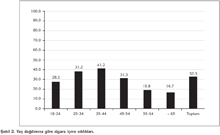 T?rkiye ?statistik Kurumu taraf?ndan 2010 y?l?nda yay?nlanan K?resel Yeti?kin T?t?n Ara?t?rmas? verilerine g?re ?lkemizde 15 ya??ndan b?y?k eri?kinlerin yakla??k ??te biri (%31.2) halen t?t?n kullanmaktad?r. T?t?n kullan?m? erkeklerde (%47.9) kad?nlara (%15.2) g?re daha yayg?nd?r. En y?ksek sigara i?me h?z? 25-44 ya? grubunda tespit edilmi?tir (11). ?al??mam?zda da benzer olarak her ?? ki?iden birinde t?t?n kullan?m? olup (%32.3), erkeklerde, 35-44 ya? grubunda en y?ksek sigara i?me oranlar? tespit edilmi?tir.