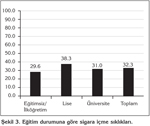 E?itim d?zeyine bak?ld???nda; lise d?zeyinde e?itim seviyesinde olanlar?n sigara i?me s?kl???n?n il geneline ve di?er e?itim seviyelerine g?re istatistiksel anlaml?l???n?n daha y?ksek oldu?u saptand? (p< 0.05). E?itim seviyesine g?re sigara i?me s?kl?klar? ?ekil 3'te g?sterildi.