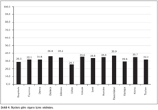 ?l?eler aras?ndaki sigara i?me s?kl?klar?na bak?ld???nda, Gebze il?esinde sigara i?enlerin oran?n?n il toplam?na g?re daha d???k oldu?u izlendi (p< 0.05). Gebze'de tespit edilen daha d???k sigara i?me oran? d???nda (%25.7) il?eler aras?nda sigara i?me prevalans? a??s?ndan anlaml? farkl?l?k tespit edilmedi (?ekil 4).