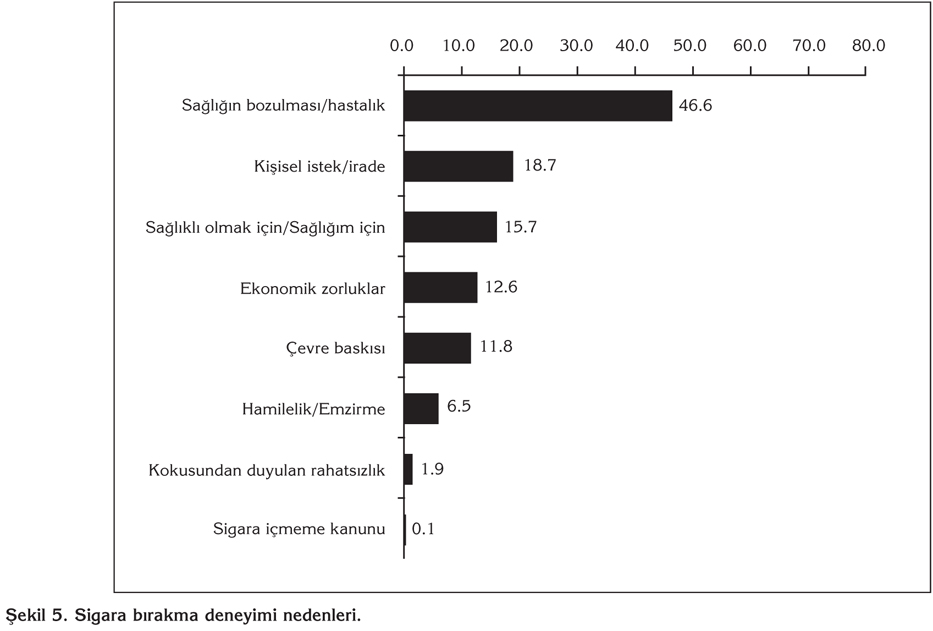 Halen sigara i?enlerin %67.7'sinin daha ?nce sigaray? b?rakmay? denemi? oldu?u saptand?. Ortalama sigara b?rakmay? deneme say?s? ?? kez, ortalama b?rakma s?resi ise be? ay olarak bulundu. Sigara b?rakmay? deneme giri?iminin en s?k nedeninin ya?anan sa?l?k sorunlar? oldu?u g?r?ld?. Di?er sebepler aras?nda ise; sa?l?k sorunlar? ya?amamak iste?i, herhangi bir nedene ba?l? olmadan b?rakmak iste?i, sigaran?n ekonomik anlamda y?k? veya yak?n ?evrenin bask?s? gibi nedenler oldu?u izlendi (?ekil 5). Olgular?n %80'i sigaray? kendi iradesiyle b?rakmay? denemi? olup, medikal destek alanlar?n oran? %5 olarak tespit edildi.