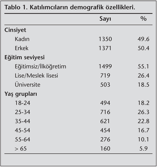 ?al??maya 1350 (%49.6)'si kad?n, 1371 (%50.4)'i erkek olmak ?zere toplam 2721 ki?i dahil edildi (Tablo 1). Aktif sigara i?me s?kl??? %32.3 (n= 902) olarak bulunurken, olgular?n %21.5 (n= 587)'inin sigaray? b?rakm?? oldu?u izlendi.