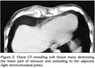 Laboratory findings revealed elevated erythrocyte sedimentation rate (ESR) of 60 mm/hour and a positive C-reactive protein (CRP) test. A plain chest radiograph posterior-anterior and lateral views, showed no lung infiltration, pleural effusion, enlargement of hilar lymph nodes and any bony involvement (Figure 1). A chest computed tomography (CT) was consistent with a soft tissue lesion destroying the lower part of sternum and extending anteriorly to the adjacent right sternochondral joints (Figure 2).