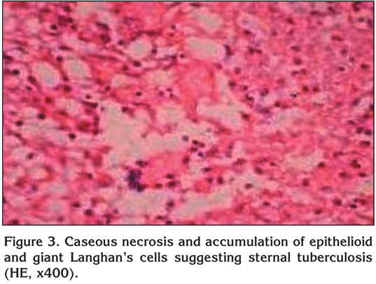 The patient underwent complete staging with brain and abdomen CT scans and a bone scan which were negative for possible metastatic disease. Fine needle aspiration (FNA) cytology was inconclusive and did not rule out malignancy. Surgical management required parasternal mass excision with en bloc excision of two right costochondral joints. Infected granulation tissue composing of a white cheesy discharge was extending to the inner table of the sternum. The granulation tissue was curetted until healthy bleeding bony surface was observed. The pectoralis major muscle was mobilized to cover the defect and the wound was closed in layers over two suction drains. The patient had an uneventful recovery. Pathology was consistent with caseous necrosis and accumulation of epithelioid and giant Langhan's cells suggesting sternal tuberculosis (Figure 3). Polymerase chain reaction (PCR) from the white cheesy discharge came positive for Mycobacterium tuberculosis. The patient was started a 4-antituberculous regimen (rifampin 600 mg/day, pyrazinamide 2000 mg/day, ethambutol 1600 mg/day and isoniazide 300 mg/day). Six months later the patient had significant improvement and a weight gain of 6 kg. He denied any symptoms, draining sinuses, sternal erythema or pain.