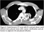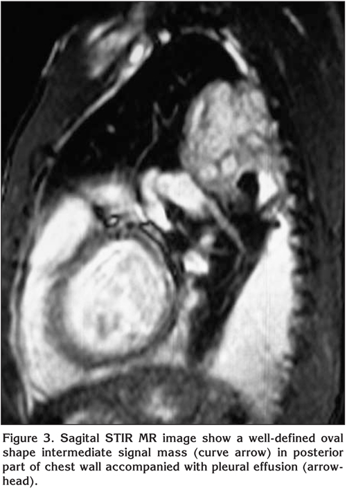 Upon arrival to the emergency department, physical examination revealed a young asthenic male not in distress. Blood pressure (BP) was 125 on 70, pulse rate was 86 BPM and respiratory rate of 18 breaths/min. The axillar temperature was 37.1 degree Celsius. The patient was normocephalic without bitemporal atrophy; other examinations were unremarkable except for dullness to percussion and the absence of breath sounds at the left lung base. The chest drain was inserted in the left hemithorax, in the fifth intercostal space-anterior axillary line. The chest drain collected 500cc of bloody non-clotting fluid which was shown to have 33% of hematocrit and was negative for bacterial culture. Computed tomographic (CT) scan of the chest showed a well-defined, extra-pleural mass with coarse calcification and adhesions to adjacent rib, and a pleural effusion (Figure 2). Magnetic resonance imaging (MRI) of the chest showed a well-defined, intermediate signal mass of oval shape in the posterior part of the chest wall accompanied by a pleural effusion (Figure 3). After the patient was stabilized (5 days later), he underwent left posterolateral thoracotomy under general anesthesia, which yielded 500-600 cc of old, clotted blood in the chest cavity. Based on the imaging techniques and presentation within the chest cavity, the tumor was believed to originate from the posterior part of the fourth rib and to extend towards vertebrae.