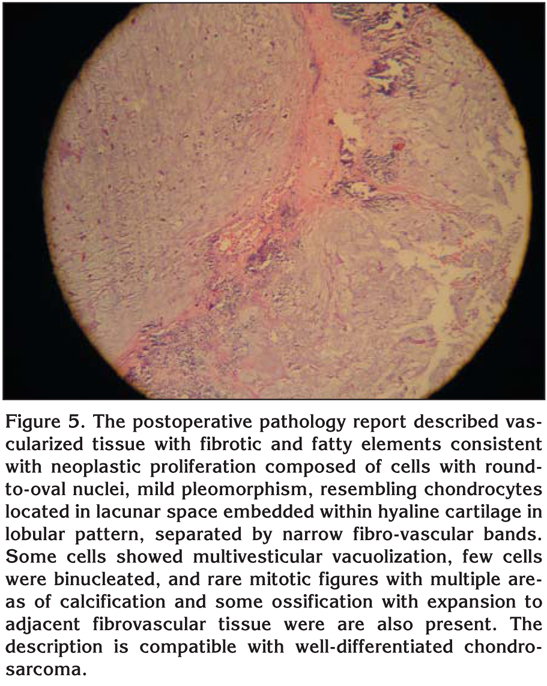 After the operation, the patient was transferred to the intensive care unit where he remained for 24 hours before being transferred to the ward. He was discharged five days after the operation. The post-operative chest roentgenogram showed no mass in the chest (Figure 4). The post-operative pathology report confirmed a Well-differentiated chondrosarcoma (Figure 5).