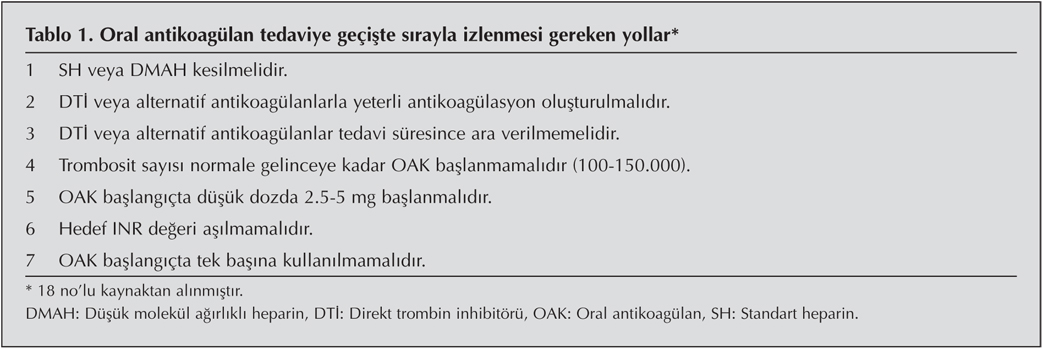HBT geli?en olgularda SH veya DMAH kesildikten sonra bile hastalar?n %38-76's?nda trombotik komplikasyonlar olu?maktad?r (11,12,13). Bu komplikasyonlar aras?nda ven?z tromboz (derin ven trombozu, PTE, adrenal hemoraji, serebral dural trombozis), arteryel tromboz (miyokard infarkt?s?, ekstremite trombozu, inme), enjeksiyon yerinde cilt lezyonlar?, akut sistemik reaksiyonlar, amp?tasyon ve D?K yer almaktad?r (8,14,15,16). Mortalite ve morbidite oranlar? SH ve DMAH'da s?ras?yla %6-18 ve %9-22 aras?nda g?sterilmektedir (17). Ancak ?zellikle HBT tan?s? alan olgularda oral antikoag?lan verilmesi durumunda risk daha da artmaktad?r. Oral antikoag?lan alan bu hastalarda mortalite ve morbidite riski s?ras?yla %56 ve? %47 olarak bildirilmektedir (18). HBT geli?en hastalarda e?er oral antikoag?lan kullan?lm??sa bunlarda d???k doz (5-10 mg) K vitamini verilmesi ?nerilmektedir (8). HBT'li hastalarda idame d?nemde oral antikoag?lan tedavi d???n?lmesi durumunda, izlenmesi gereken yol Tablo 1'de ?zetlenmi?tir (19).