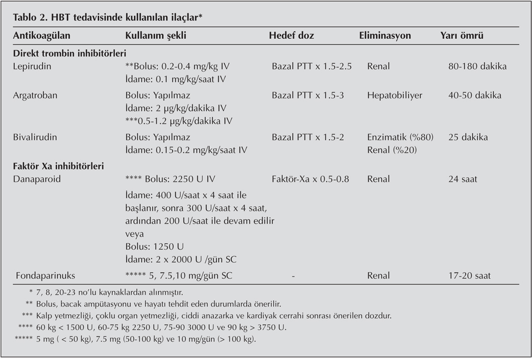 HBT trombin olu?umuna e?ilimin artt??? protrombotik bir akut hiperkoag?labilite sendromudur. Dolay?s?yla HBT durumunda tedavinin amac? trombin olu?umunun engellenmesidir. Bu ama?la HBT tedavisinde direkt trombin inhibit?rleri (DT?); argatroban, lepirudin, bivalirudin veya indirekt fakt?r Xa inhibit?rleri; danaparoid ve fondaparinuks kullan?lmaktad?r. DT? etkisi PTT ve INR ile takip edilebilirken, fakt?r Xa inhibit?rleri PTT ve INR'yi etkilememektedir (8). Di?er yandan DT? ve fakt?r Xa inhibit?rlerinin ?zellikle kanama gibi yan etki durumunda kullan?lacak spesifik antidotlar?n?n bulunmamas? en ?nemli dezavantaj?d?r. HBT tedavisinde kullan?lan molek?llerin farmakolojik ?zellikleri Tablo 2'de ?zetlenmi?tir (7,8,20,21,22,23).