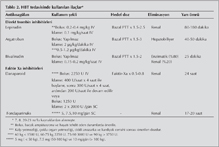 Bivalirudin 20 aminoasit i?eren peptid yap?da nonheparin antikoag?land?r. Genellikle enzimatik yolla metabolize oldu?undan hem renal hem de hepatik yetmezlik durumunda kullan?lma avantaj? vard?r. Ancak etki s?resinin k?sa olmas? yeni tromb?s olu?ma riski a??s?ndan ?nemli bir dezavantaj?d?r. ?nerilen dozu IV yolla 0.15-0.2 mg/kg/saat ?eklindedir (8).