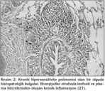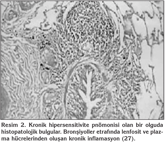 Akci?er dokusunun histopatolojik incelenmesi genellikle HP tan?s? i?in gerekli de?ildir. D???k klinik olas?l?kl?, tam tan? kriterlerini kar??lamayan olgularda e?er akci?er dokusuna ihtiya? varsa a??k akci?er biyopsisi ?nerilmektedir. Transbron?iyal akci?er biyopsisinin HP'de tan?sal verimlili?i d???kt?r. Akut HP'de n?trofilik infiltratlarla beraber akut bron?iyolit g?r?l?r. Subakut HP'de dif?z interstisyel lenfositik infiltrasyon, k???k nonnekrotizan gran?lomlar ve sel?ler bron?iyolit klasik triadd?r. Gran?lomlar epiteloid histiyosit, dev h?creler ve lenfositlerden meydana gelir. Di?er bulgular ise plazma h?creleri, mast h?creleri, k?p?ks? alveoler makrofajlar ve dev h?crelerdir. Bron?iyolitis obliterans da subakut HP'nin di?er bir histopatolojik bulgusudur. ?nterstisyel fibrozis ve interstisyel lenfositik infiltrasyon kronik HP bulgular?d?r (Resim 2). Fibrozis ileri evrelerde balpete?i akci?er ile sonu?lanabilir. Yukar?da s?z edilen histopatolojik bulgular?n hi?biri HP'ye spesifik de?ildir, di?er interstisyel patolojilerde de g?r?lebilir (25,26,28).