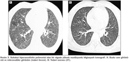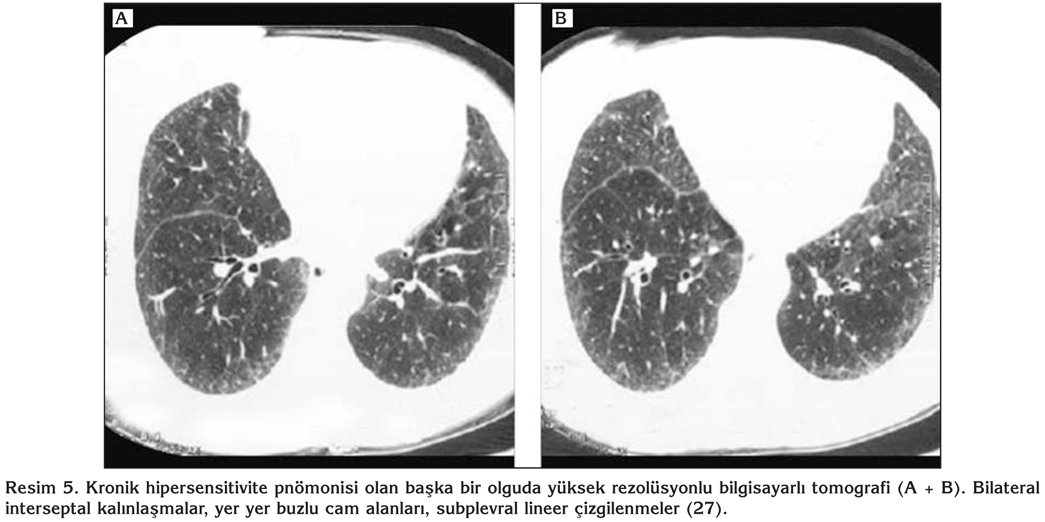 Yay?nlad???m?z ?al??mada bir olgu muhabbet ku?u beslemesi sonucu ?? ayd?r olan nefes darl??? ve ?ks?r?k ?ikayetiyle ba?vurmu?tu. Fizik incelemede bibaziler ralleri mevcuttu. Solunum fonksiyon testi normal ancak dif?zyon kapasitesi azalm??t?. Olgunun YRBT'sinde Resim 3A'da g?r?ld??? ?zere bilateral buzlu cam g?r?n?m? ve sentrilob?ler mikronod?lleri mevcuttu. Olgu bronkoskopiyi kabul etmedi?i i?in BAL ve transbron?iyal akci?er biyopsisi al?namad?. Prednizolon 40 mg/g?n tedavisi ile klinik ve radyolojik olarak d?zeldi (Resim 3B). Di?er bir olgumuz ku? besleyen ve ?? y?ld?r nefes darl??? olan ?ks?r?k ?ikayetiyle ba?vuran bir olguydu. Fizik incelemesi ve solunum fonksiyon testi normal, dif?zyon kapasitesi d???kt?. YRBT'sinde bilateral retik?lonod?ler infiltrasyonlar? mevcuttu (Resim 5A,B), BAL lenfositikti. Olgunun semptomlar? antijen maruziyetinin kesilmesiyle iyile?ti (27).