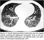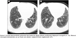 Kronik HP'de fibrozis bulgular? olan d?zensiz lineer opasiteler, bal pete?i akci?er ve traksiyon bron?ektazisi YRBT bulgular?d?r (Resim 4, 5). Bulgular ?st ve orta zonlarda lokalizedir. Subakut evrenin tipik bulgular? olan sentrilob?ler nod?ller ve buzlu cam kronik evrede de g?r?lebilir, bu devam eden antijen temas?n?n g?stergesidir. Amfizem de sigara i?meyen kronik HP'lerin %20'sinde g?r?len bir bulgudur (29,30,31,32).