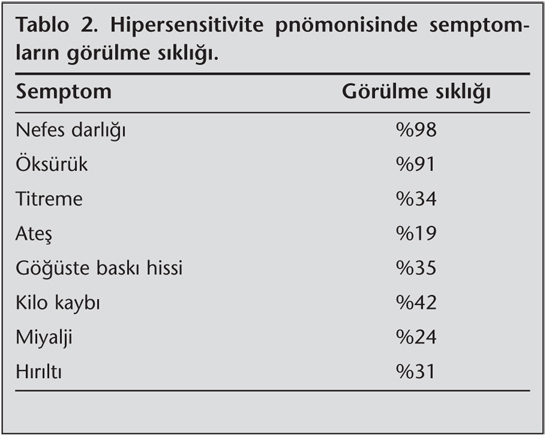 Ekstrensek allerjik alveolit olarak da bilinen hipersensitivite pn?monisi (HP), organik toz partik?llerin veya ?e?itli kimyasal maddelerin tekrarlayan inhalasyonu sonucu geli?en IgE arac?l? olmayan bir hipersensitivite reaksiyonudur (1). ?lk kez 1713 y?l?nda Ramazzini, ?ift?ilerde HP'ye benzer bir hastal?k tan?mlam??t?r. ?ift?i akci?eri ise ilk olarak 1932 y?l?nda ?ngiltere'de Cambell taraf?ndan yay?nlanm??t?r. O zamandan bu yana ?ok ?e?itli antijenlerin neden oldu?u bir?ok HP tipi yay?nlanm??t?r. Etkenler farkl? olsa da benzer klinik, radyolojik ve patolojik ?zellikler ortak bir patogenezin oldu?unu d???nd?rtmektedir (2).