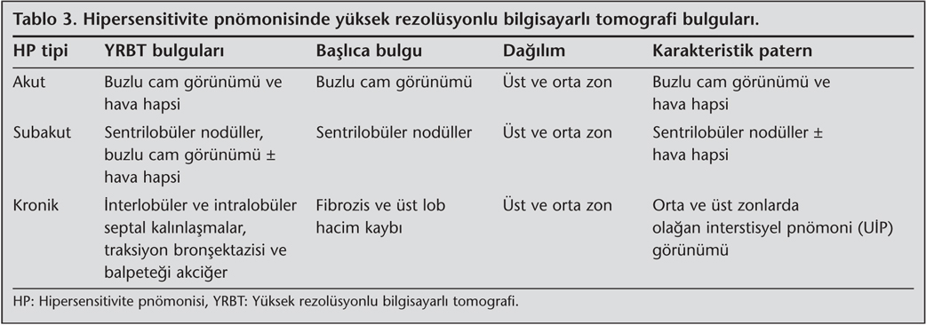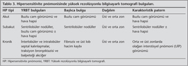 YRBT'nin HP tan?s?nda akci?er grafisine ?st?nl??? bir?ok ?al??ma ile g?sterilmi?tir. Ba?l?ca YRBT bulgusu buzlu cam g?r?n?m?d?r. Sentrilob?ler nod?ller ve konsolidasyon, mozaik perf?zyon, hava hapsi alanlar? ve fibrotik de?i?iklikler de di?er bulgulard?r (Tablo 3) (29).