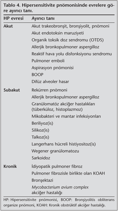 Akut HP tan?s? kolayl?kla bir viral infeksiyon, atipik pn?moni veya bron?it d???n?lerek atlanabilir. Respiratuar vir?sler i?in al?nacak nazofarengeal s?r?nt?, bakteriyel serolojik incelemeler ve kan k?lt?rleri tan?da yard?mc? olur. ?zellikle ?ift?ilerde HP ay?r?c? tan?s?nda Organik Toksik Doz Sendromu (OTDS) mutlaka d???n?lmelidir. OTDS ??r?m?? samandan ortaya ??kan bakteriyel ve fungal endotoksinlere maruziyet sonucu meydana gelir. Ba?l?ca bulgular?; ate?, ?ks?r?k ve g???ste bask? hissidir. Solunum fonksiyon testi, dif?zyon kapasitesi ve akci?er grafisi normaldir. Kanda spesifik bir antikora rastlanmaz. Balgam k?lt?r?nde ve akci?er biyopsisinde fungal sporlar saptanabilir. Akci?er biyopsisinde gran?lom g?r?lmez. HP'nin ay?r?c? tan?s?nda akla gelecek hastal?klar Tablo 4'te s?ralanm??t?r (12,26).
