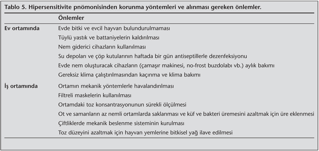 Tedavide en ?nemli nokta erken tan? ve antijen maruziyetinin en k?sa s?rede kesilmesidir. Antijen temas?n?n kesilmesi ekonomik ve sosyal nedenlerden dolay? her zaman m?mk?n olmamaktad?r. B?yle durumlarda ise hem ev hem de i? ortam?nda ?e?itli ?nlemlerin al?nmas? gerekmektedir (12). Bu ?nlemler Tablo 5'te ?zetlenmi?tir.