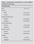 Mean age of the children enrolled in the study was 8.1 ? 3.4 and ranged between 2 and 17 years. Among all children 53.2% were males and 46.8% were females. Tonsil hypertrophy was present in 16.2% and 13.5% had allergic rhinitis (Table 1).