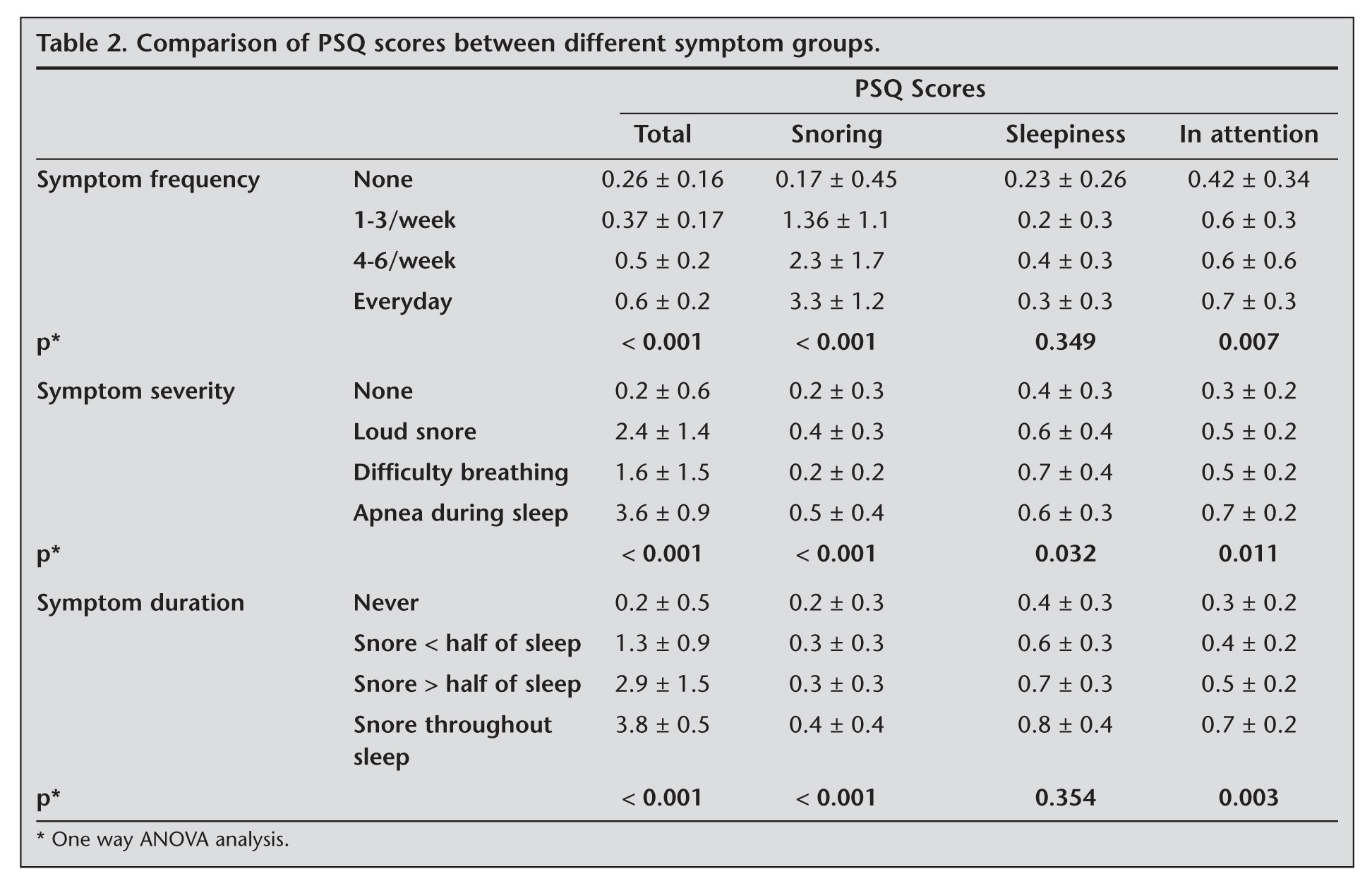 When children were grouped according to symptom severity, there was a significant difference of all PSQ scores among the groups (p< 0.05 for all). Total score was calculated to be 0.2 ? 0.6 in children who did not report severe symptoms while it was calculated as 3.6 ? 0.9 in children with apnea during sleep (p< 0.001) (Table 2).